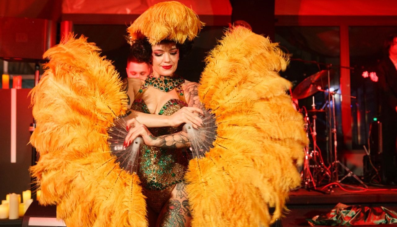 Джазовый бэнд оживляет пространство горячими ритмами, артистки кружат в вихре перьев, а акробаты парят так, будто подчиняют себе гравитацию.