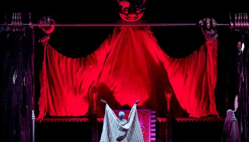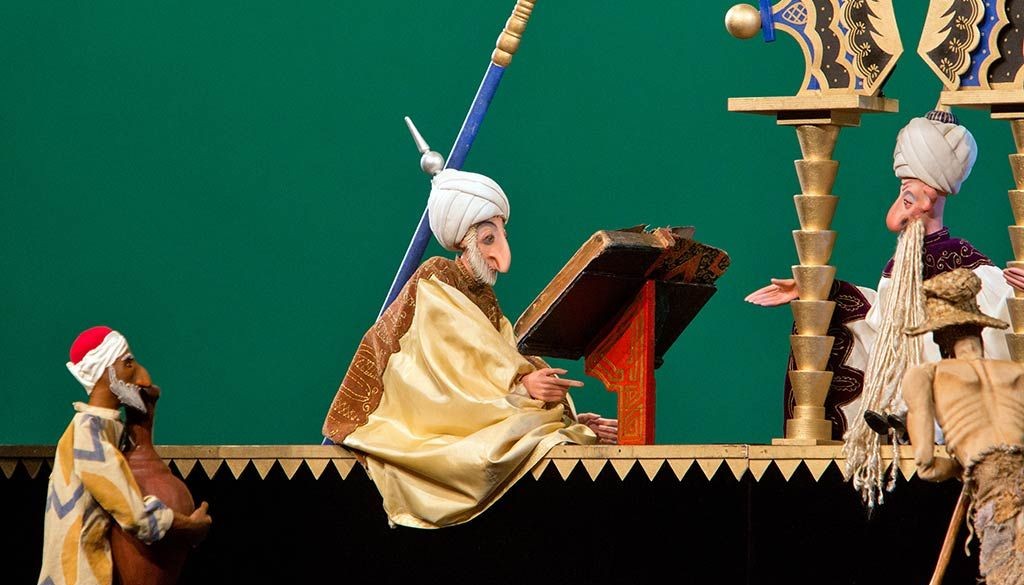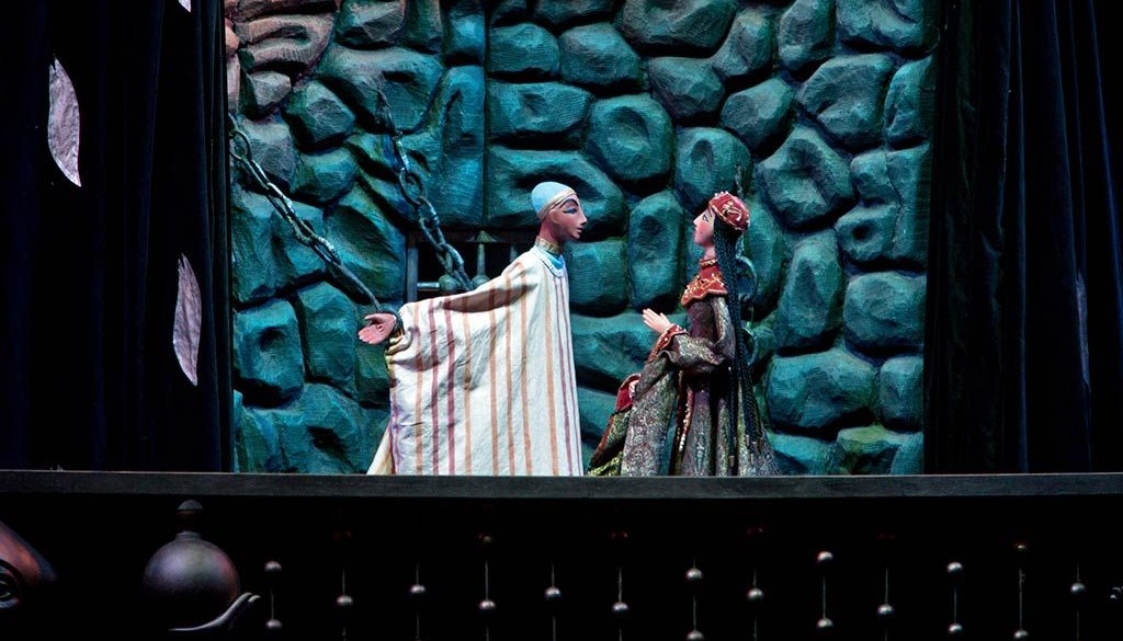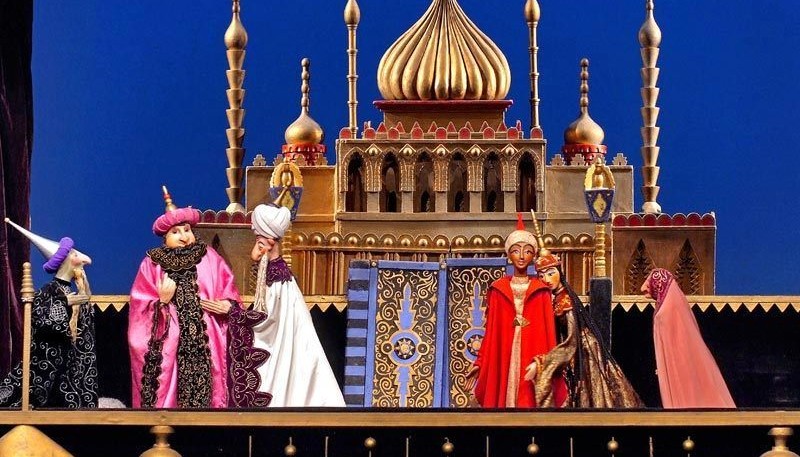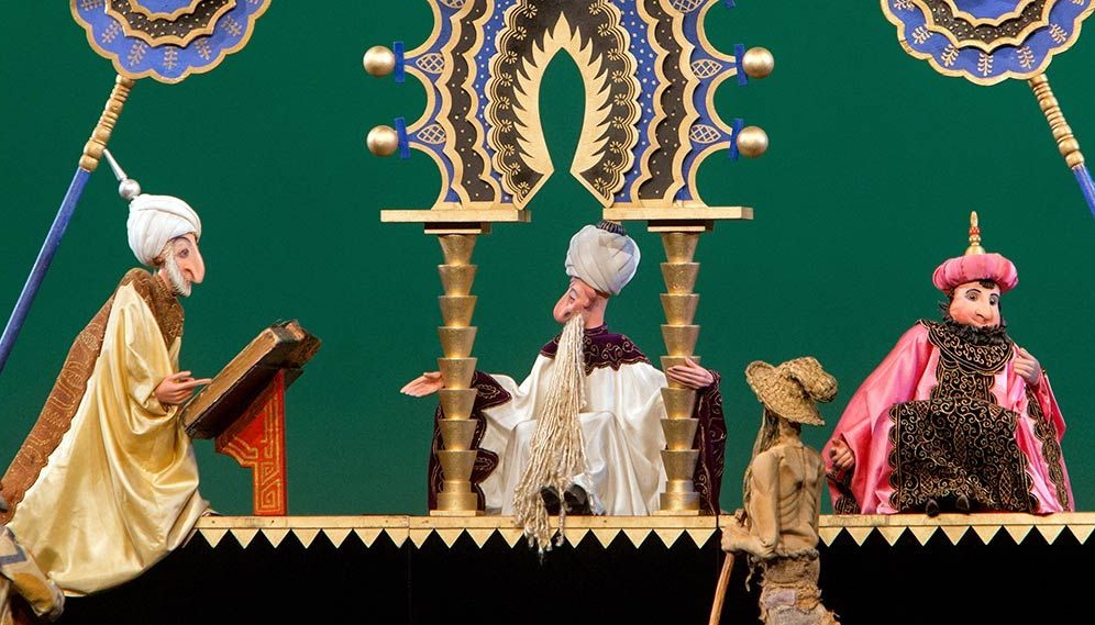 Это один из самых красивых спектаклей театра: восточный город с золотыми дворцами, магия сказочных превращений и грациозные тростевые куклы, а также грозный Джинн Кашкаш.
