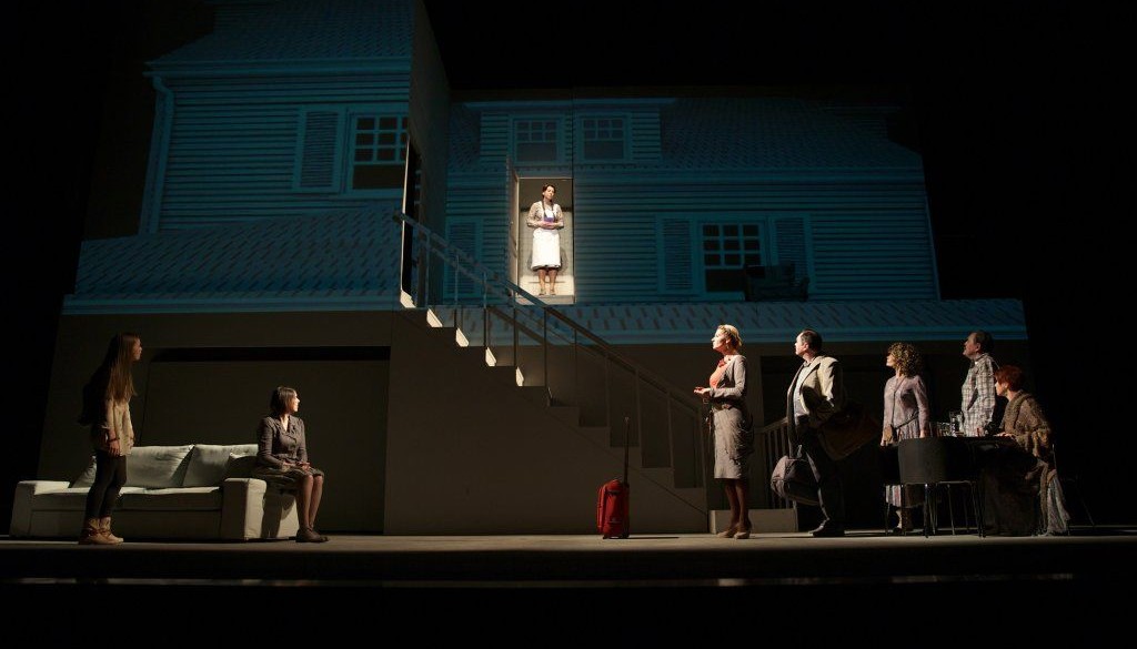 Латышский художник Гинтс Габранс сооружает на сцене геометрическую конструкцию — типичный современный дом со стандартным дизайном. С помощью технологии мэппинга на белых стенах декорации возникает образ дома Уэстонов — 3D-модель, сделанная по размеру настоящего дома. Это реальный дом — гостиная, кухня, ванная, кабинет, мансарда. Выдвигающиеся панели декорации по ходу спектакля дают новые срезы: параллельно с драматическими столкновениями на сцене двигается, меняет цвета и ракурсы цифровой образ дома. Дом открывает свои тайны — как рентгеном просвечивается скелет семейной истории.