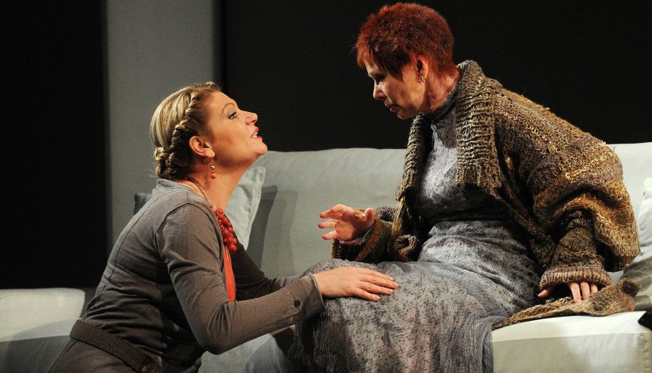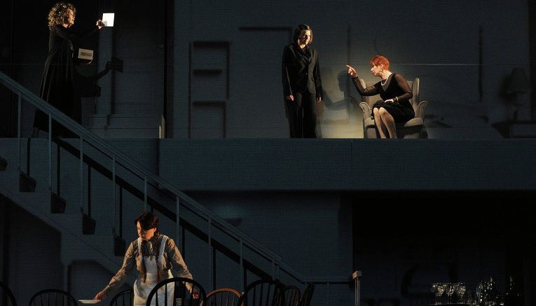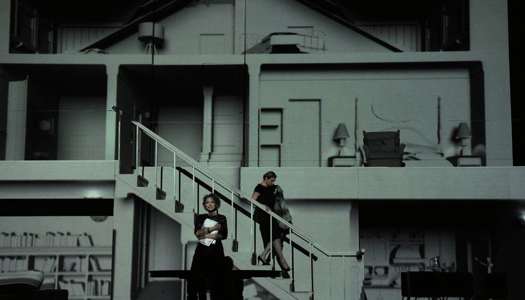 В постановке Гиртса Эциса семейная история выглядит то кинематографической реальностью в цветной 3D-проекции, то вдруг становится стилизованно театральной на фоне аскетично белых панелей дома. То герои живут реальной жизнью, где «нет ни черного, ни белого, и этим объясняется все», то вдруг надевают маски тех, кем являются в иерархии семьи.
