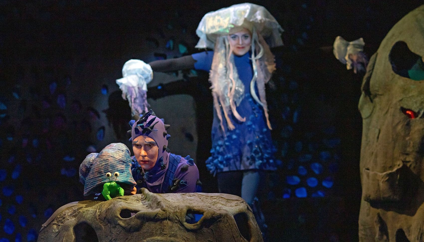 В спектакле по одноимённой сказке Бориса Заходера все удивительно от начала до конца. И сиятельные Морские Звезды, и мудрые Дельфины, и болтливые Рыбы-Попугаи, и даже страшная Госпожа К. — такая страшная, что рыбы и крабы не решаются произнести ее полное имя.