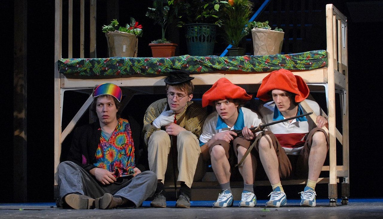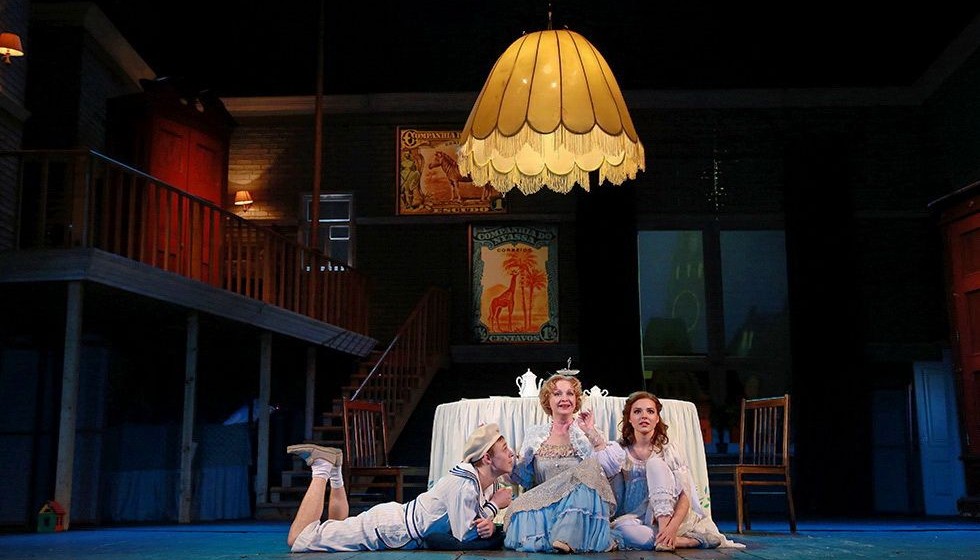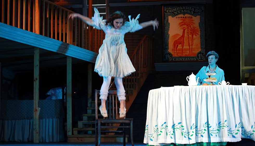 И только полеты в спектакле не воображаемые, а самые настоящие. Актеры действительно взмывают ввысь. Конечно, этот трюк удается им не без помощи специальных приспособлений. Декорации подчёркивают детское видение окружающего пространства: столы, стулья, шкафы и лестница на второй этаж сделаны громадными, какими они всем казались в детстве.